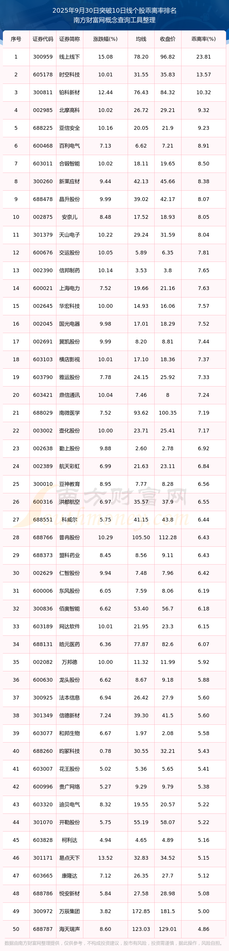 2025年9月30日突破10日線個(gè)股乖離率排名