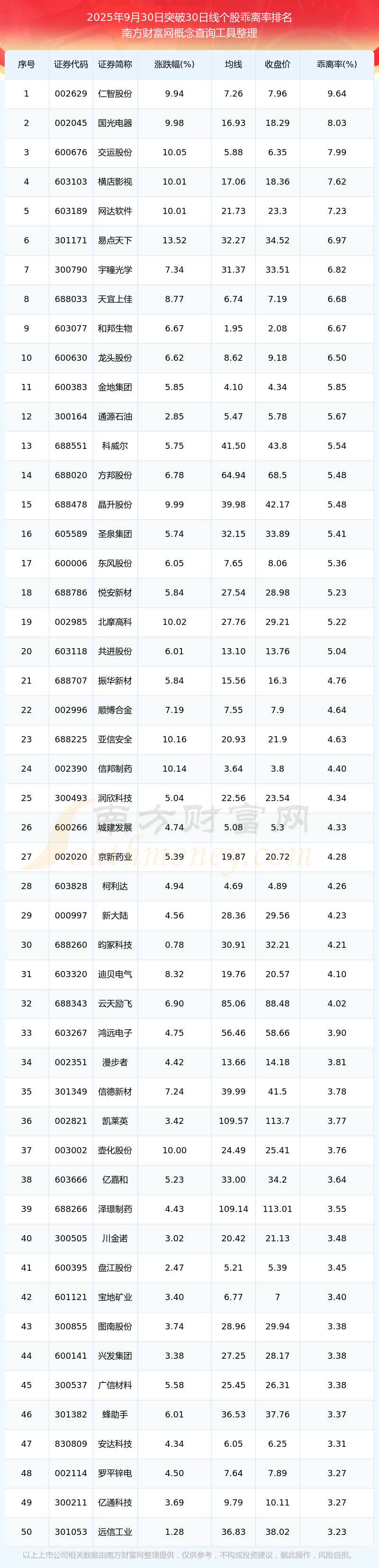 根據(jù)南方財富網(wǎng)概念查詢工具數(shù)據(jù)統(tǒng)計,截止2025年9月30日收盤,共有317只個股收盤價向上突破了30日線,其中乖離率較大的個股有仁智股份、國光電器、交運股份、橫店影視、網(wǎng)達軟件等,乖離率分別為9.64%、8.03%、7.99%、7.62%、7.23%。