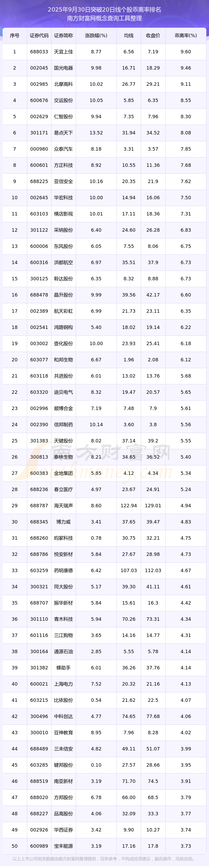 根據(jù)南方財富網(wǎng)概念查詢工具數(shù)據(jù)統(tǒng)計,截止2025年9月30日收盤,共有436只個股收盤價向上突破了20日線,其中乖離率較大的個股有天宜上佳、國光電器、北摩高科、交運股份、仁智股份等,乖離率分別為9.60%、9.46%、9.11%、8.55%、8.30%。