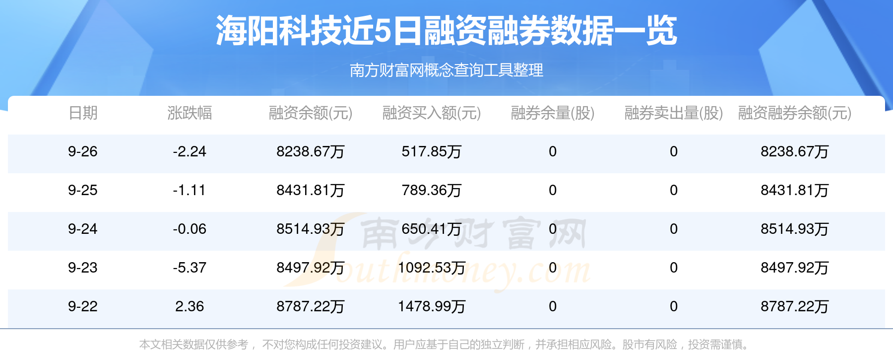 9月26日海陽科技融券信息顯示,融資方面,當(dāng)日融資買入517.85萬元,融資償還710.99萬元,融資凈買額-193.14萬元。近5日融資融券數(shù)據(jù)一覽見下表: