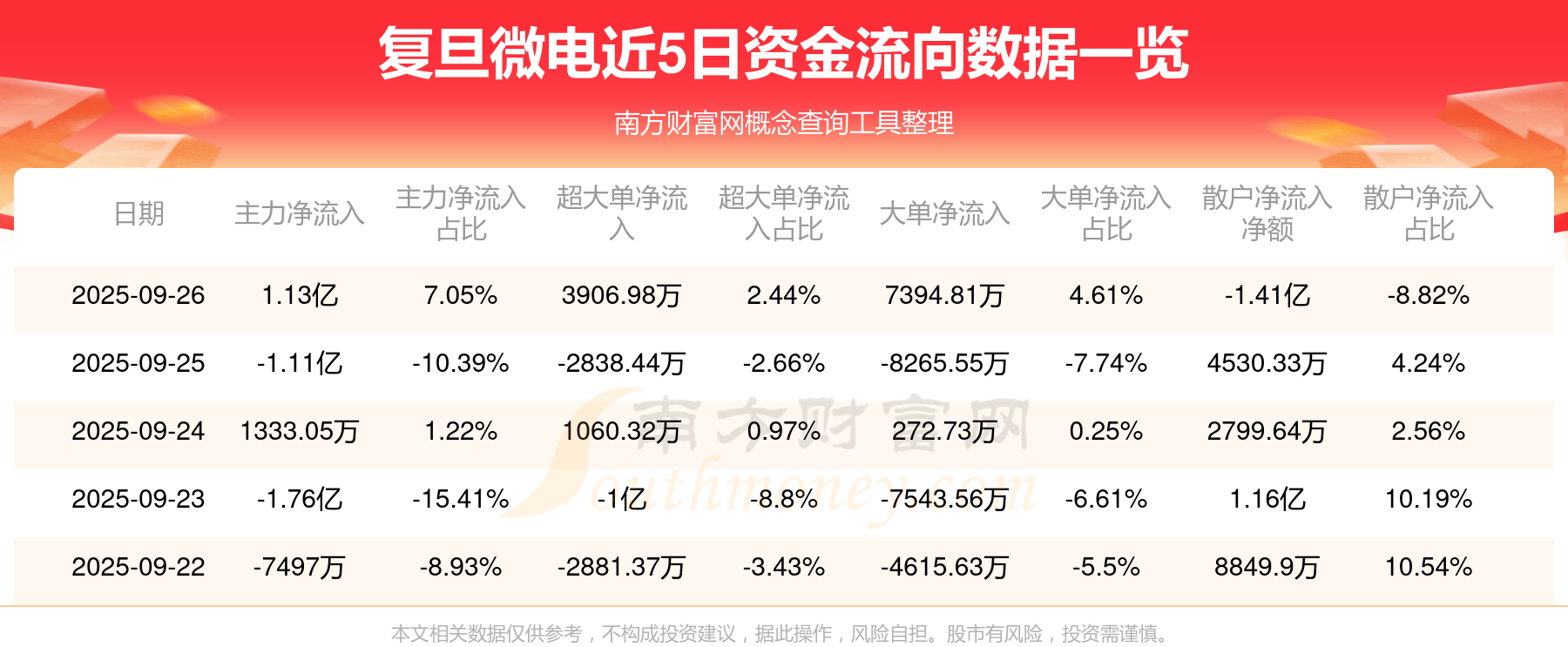 9月26日消息,復(fù)旦微電主力凈流入1.13億元,超大單凈流入3906.98萬元,散戶凈流出1.41億元。