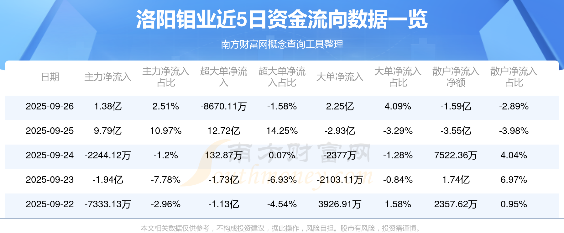 9月26日消息,洛陽鉬業(yè)9月26日主力資金凈流入1.38億元,超大單資金凈流出8670.11萬元,大單資金凈流入2.25億元,散戶資金凈流出1.59億元。