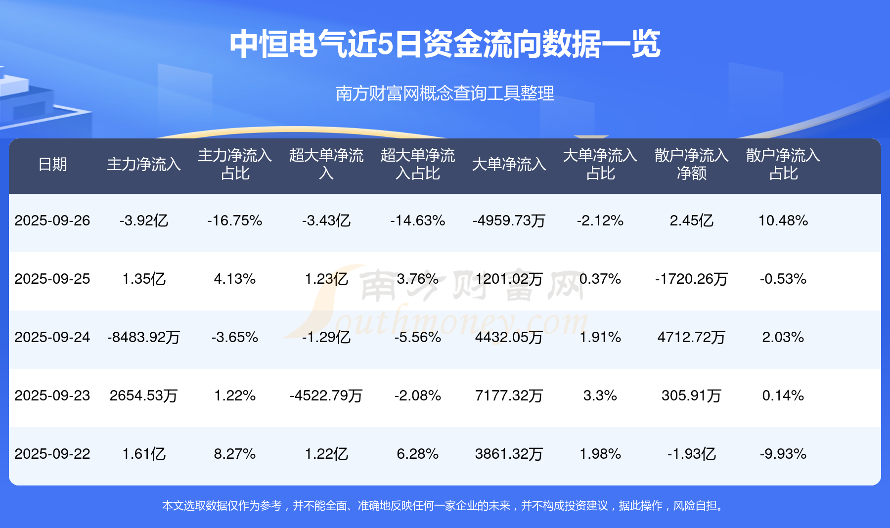 9月26日消息,中恒電氣資金凈流出3.92億元,超大單凈流出3.43億元,換手率13.8%,成交金額23.43億元。