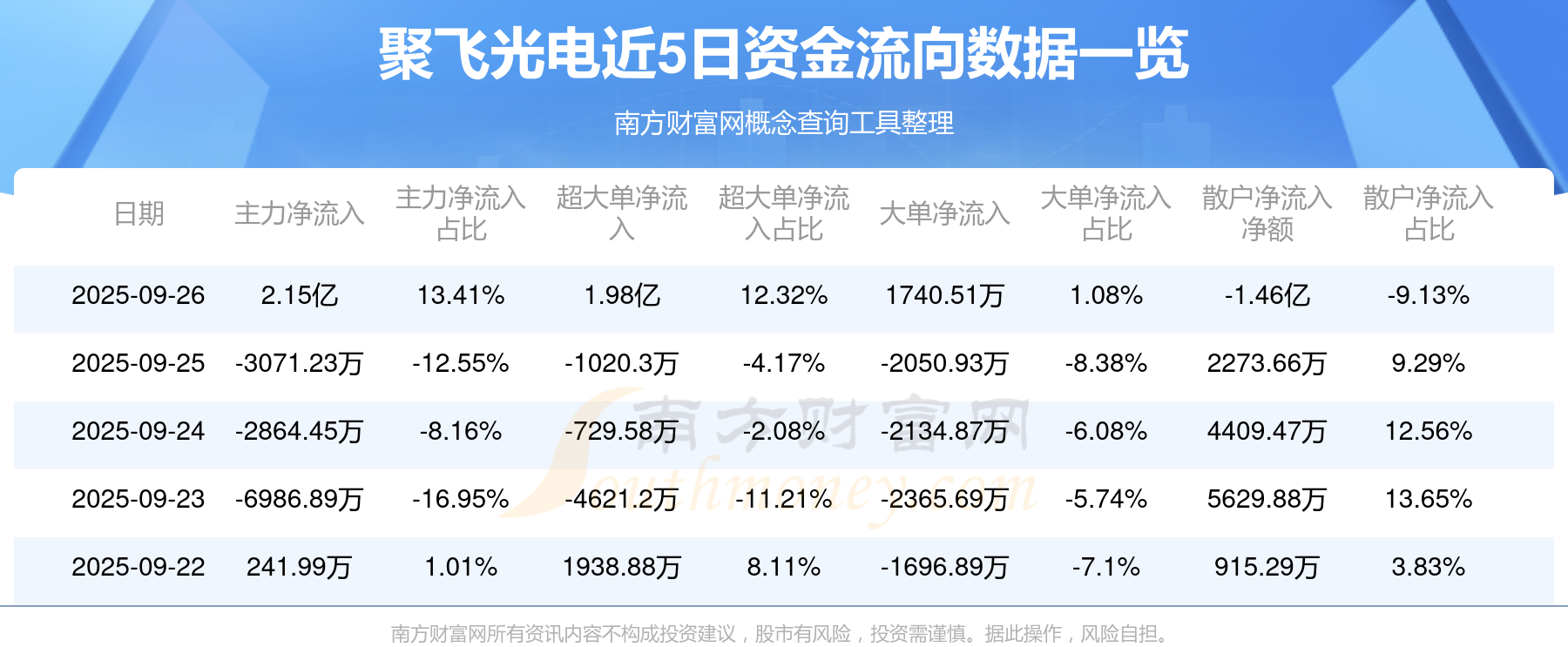9月26日消息,聚飛光電資金凈流入2.15億元,超大單資金凈流入1.98億元,換手率16.78%,成交金額16.05億元。