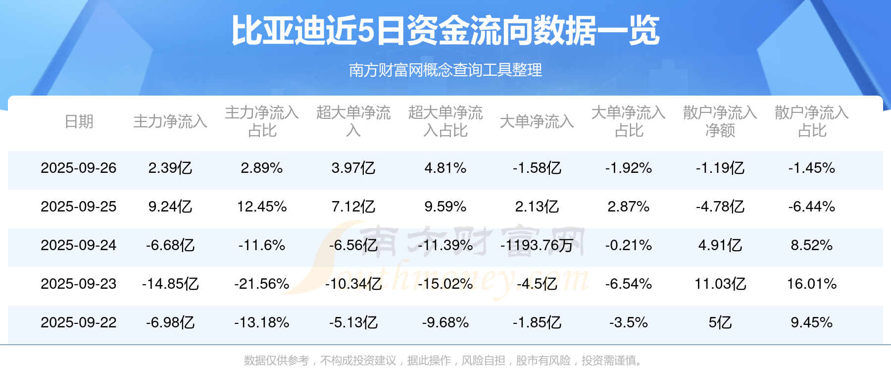 9月26日消息,比亞迪資金凈流入2.39億元,超大單凈流入3.97億元,換手率2.17%,成交金額82.5億元。
