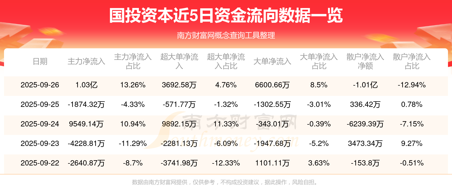 資金流向數(shù)據(jù)方面,9月26日主力資金凈流流入1.03億元,超大單資金凈流入3692.58萬元,大單資金凈流入6600.66萬元,散戶資金凈流出1.01億元。