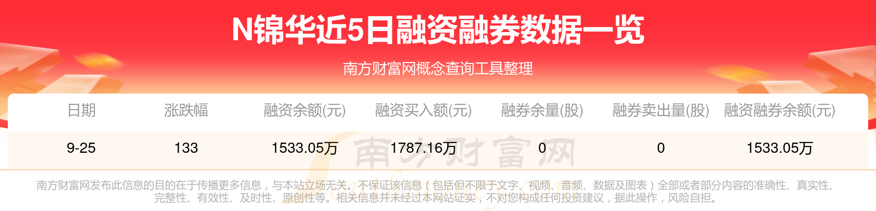 N錦華9月25日融券信息顯示,融資方面,當(dāng)日融資買入1787.16萬元,融資償還254.11萬元,融資凈買額1533.05萬元。近5日融資融券數(shù)據(jù)一覽見下表: