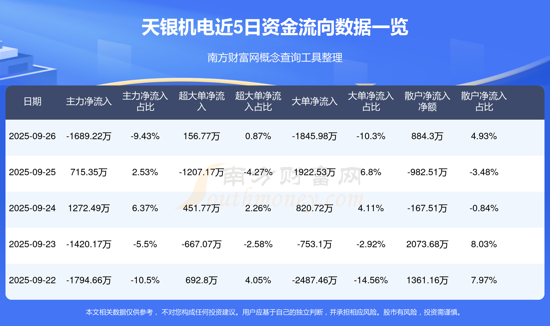 9月26日消息,天銀機電主力資金凈流出1689.22萬元,超大單資金凈流入156.77萬元,散戶資金凈流入884.3萬元。