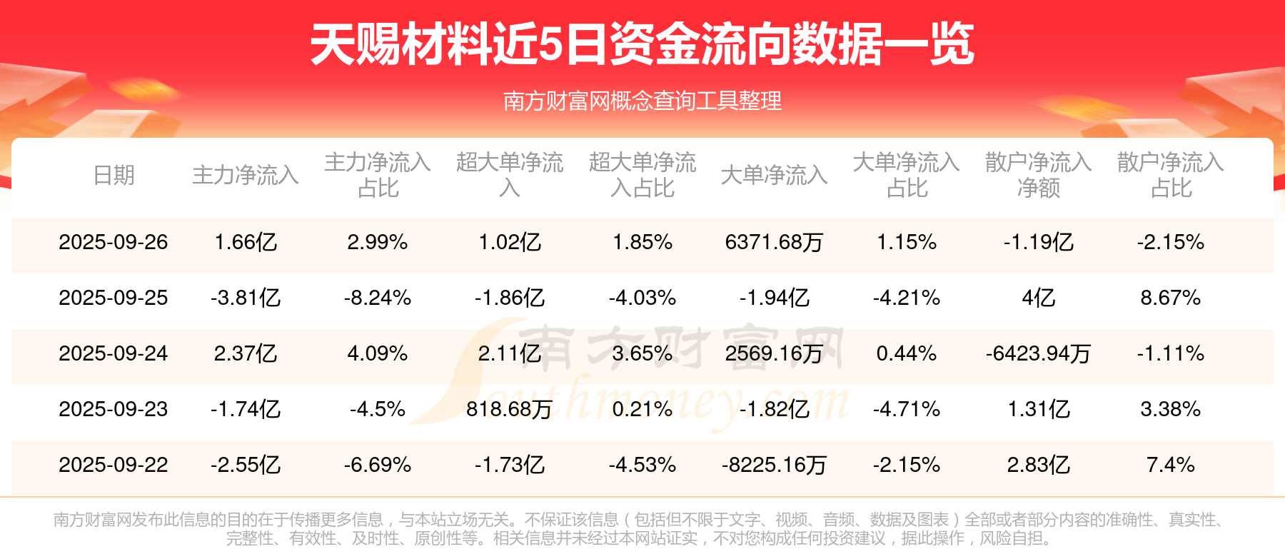 9月26日消息,天賜材料主力凈流入1.66億元,超大單凈流入1.02億元,散戶凈流出1.19億元。