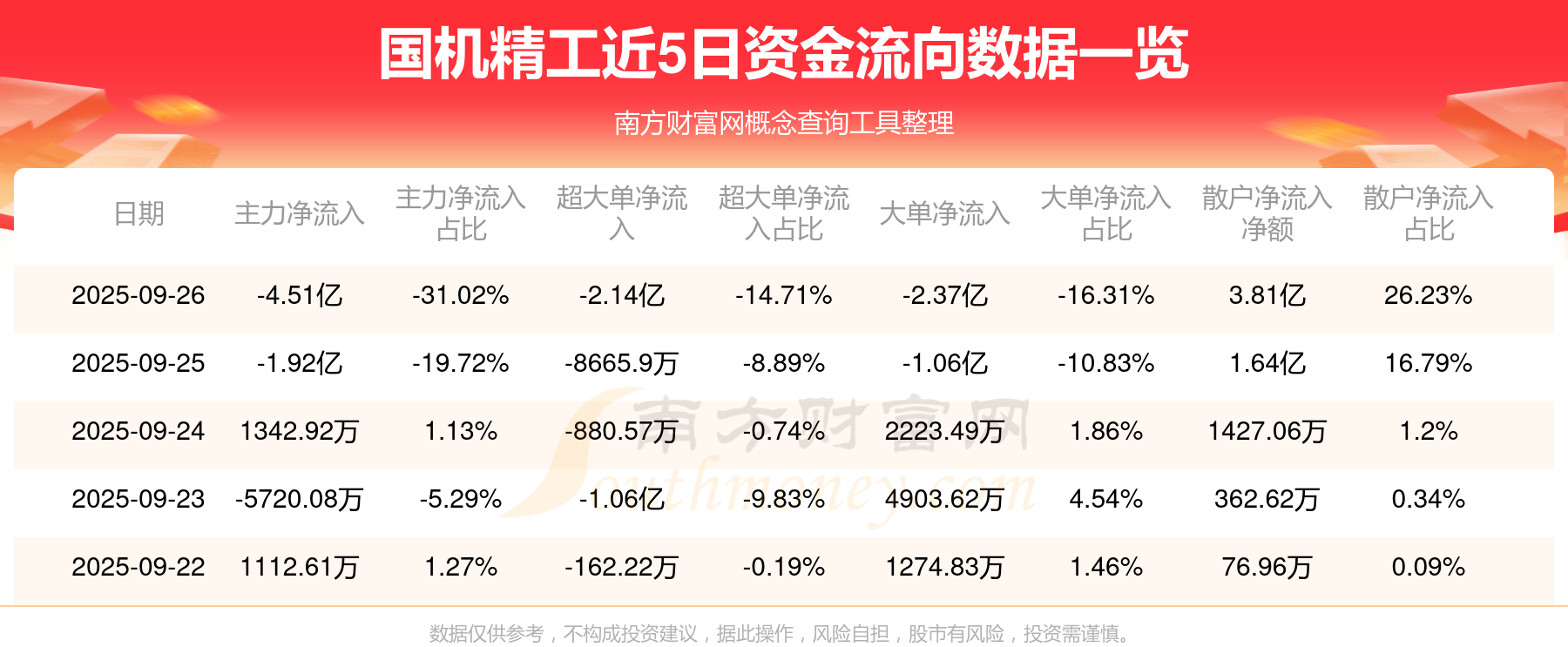 9月26日消息,國機精工主力資金凈流出4.51億元,超大單資金凈流出2.14億元,散戶資金凈流入3.81億元。