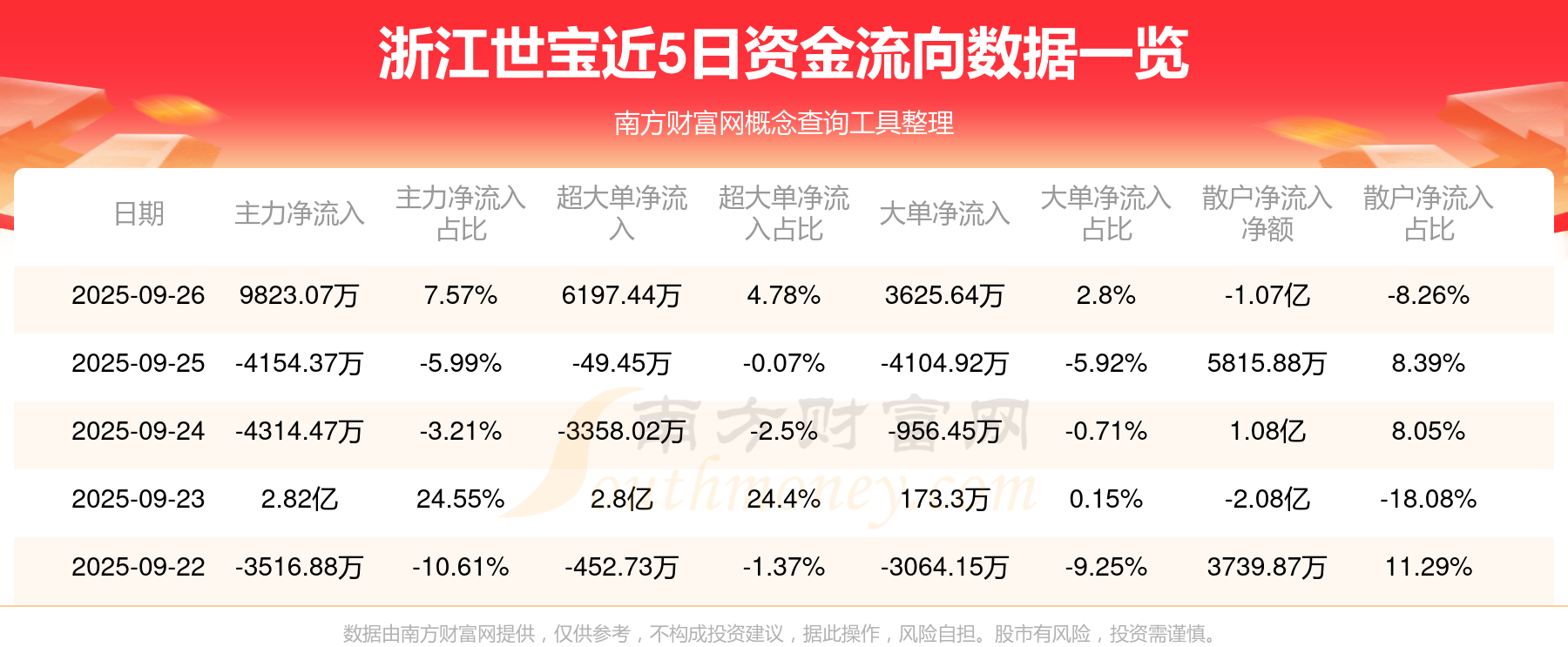 9月26日消息,浙江世寶主力資金凈流入9823.07萬元,超大單資金凈流入6197.44萬元,散戶資金凈流出1.07億元。