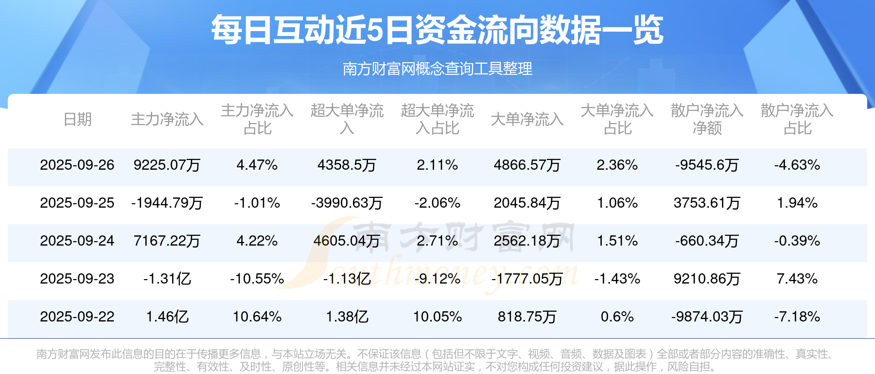 9月26日該股主力資金凈流入9225.07萬元,超大單資金凈流入4358.5萬元,大單資金凈流入4866.57萬元,中單資金凈流入320.52萬元,散戶資金凈流出9545.6萬元。