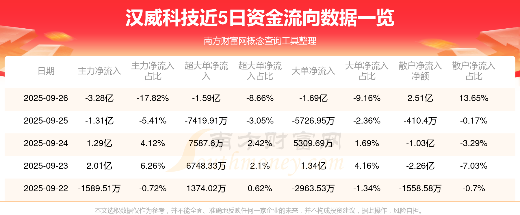 9月26日消息,漢威科技9月26日主力凈流出3.28億元,超大單凈流出1.59億元,大單凈流出1.69億元,散戶凈流入2.51億元。