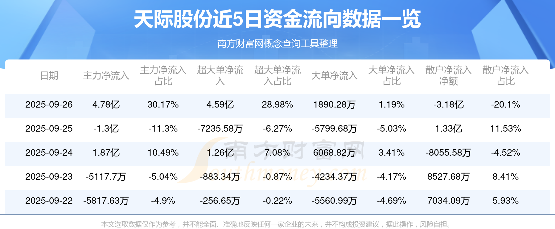 9月26日消息,天際股份9月26日主力凈流入4.78億元,超大單凈流入4.59億元,大單凈流入1890.28萬元,散戶凈流出3.18億元。