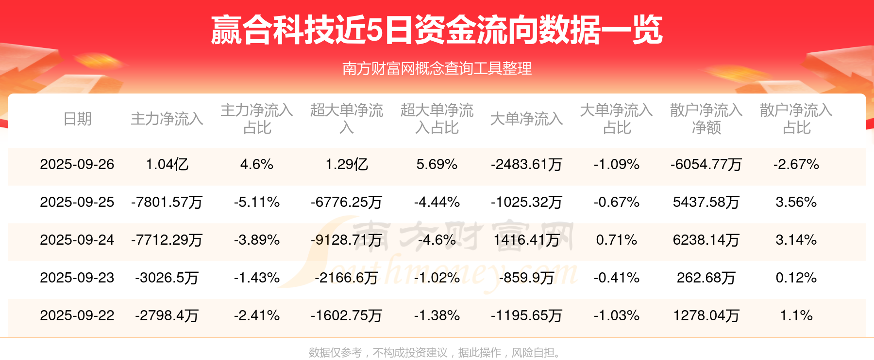 9月26日消息,贏合科技主力凈流入1.04億元,超大單凈流入1.29億元,散戶凈流出6054.77萬(wàn)元。