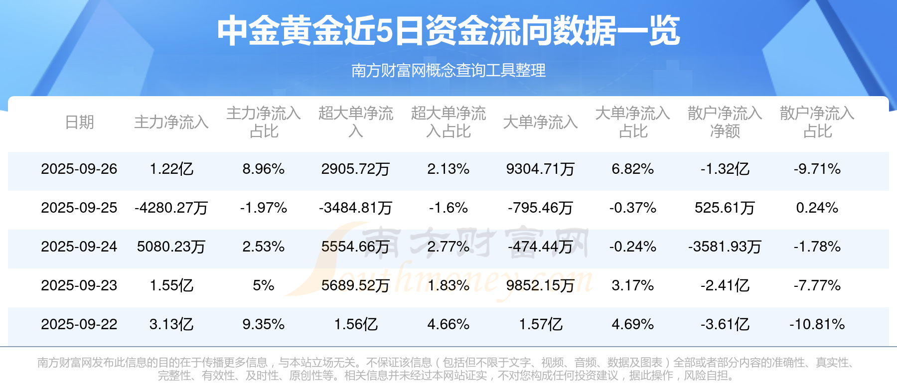 9月26日消息,中金黃金9月26日主力凈流入1.22億元,超大單凈流入2905.72萬元,大單凈流入9304.71萬元,散戶凈流出1.32億元。