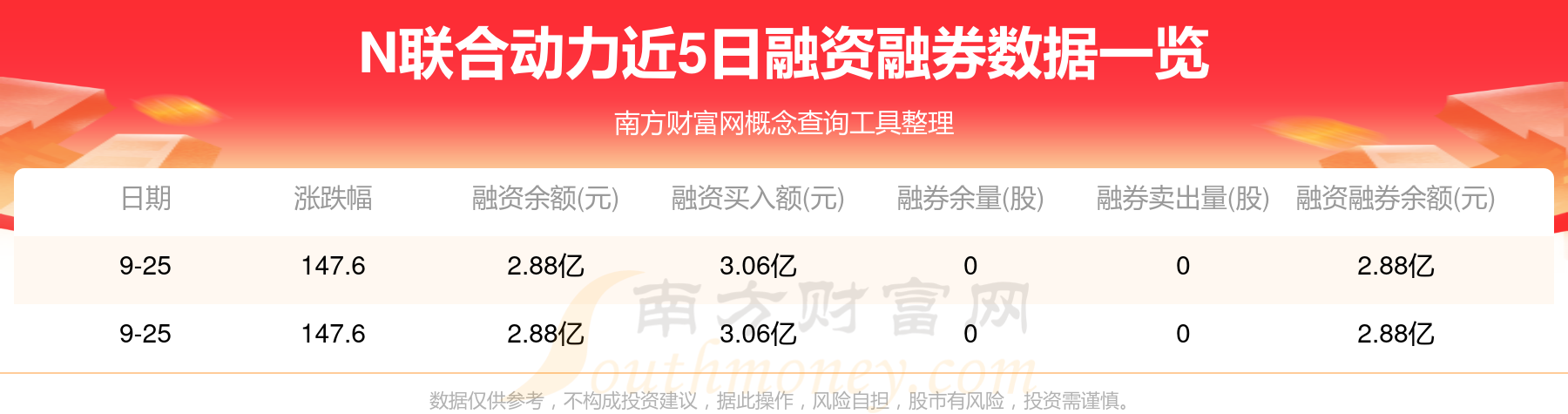 N聯(lián)合動(dòng)力9月25日融券信息顯示,融資方面,當(dāng)日融資買入3.06億元,融資償還1773.7萬元,融資凈買額2.88億元。近5日融資融券數(shù)據(jù)一覽見下表: