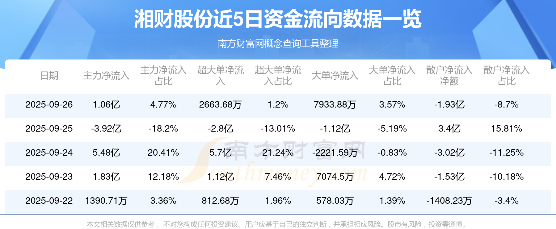 9月26日消息,湘財股份主力資金凈流入1.06億元,超大單資金凈流入2663.68萬元,散戶資金凈流出1.93億元。