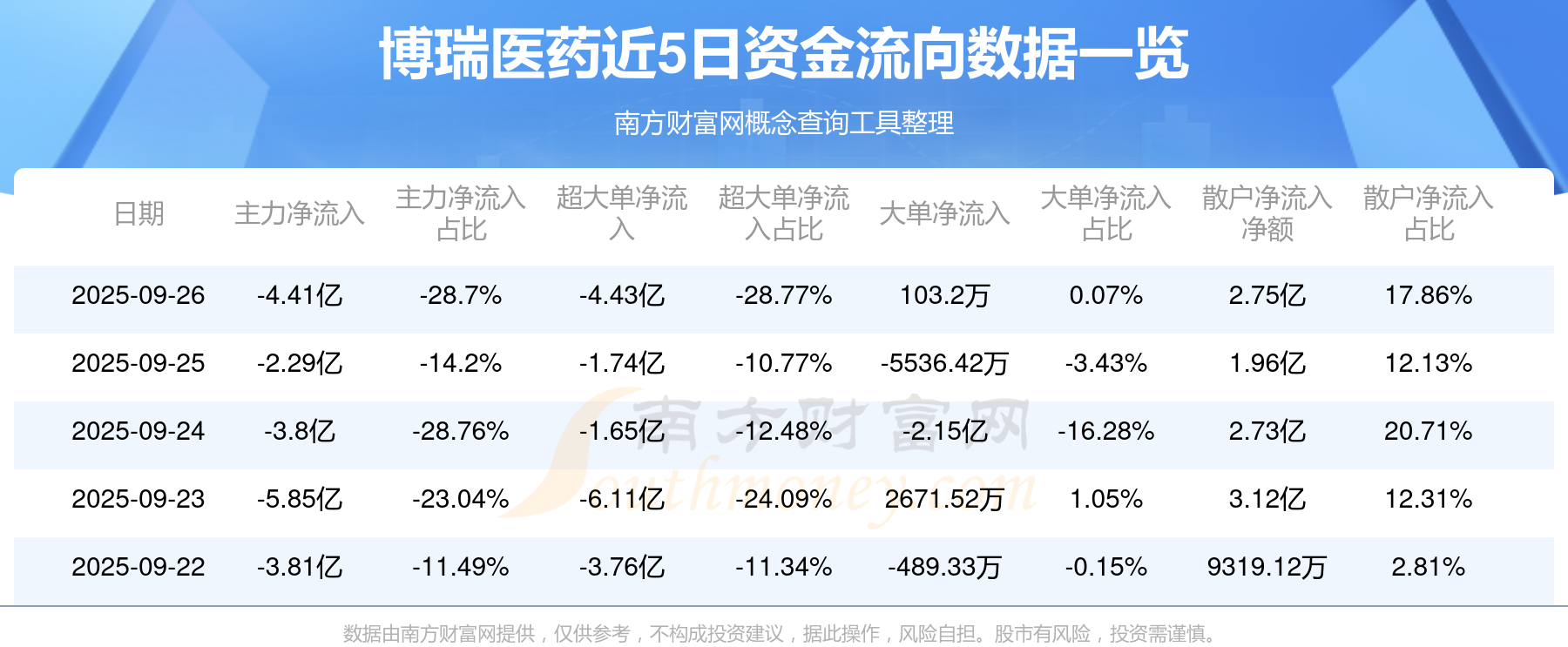 9月26日消息,博瑞醫(yī)藥主力資金凈流出4.41億元,超大單資金凈流出4.43億元,散戶(hù)資金凈流入2.75億元。
