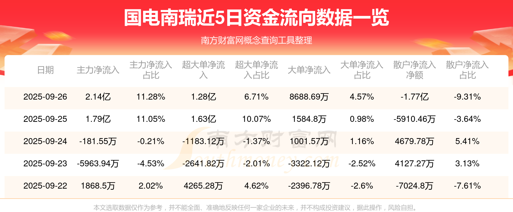9月26日消息,國(guó)電南瑞9月26日主力凈流入2.14億元,超大單凈流入1.28億元,大單凈流入8688.69萬(wàn)元,散戶凈流出1.77億元。