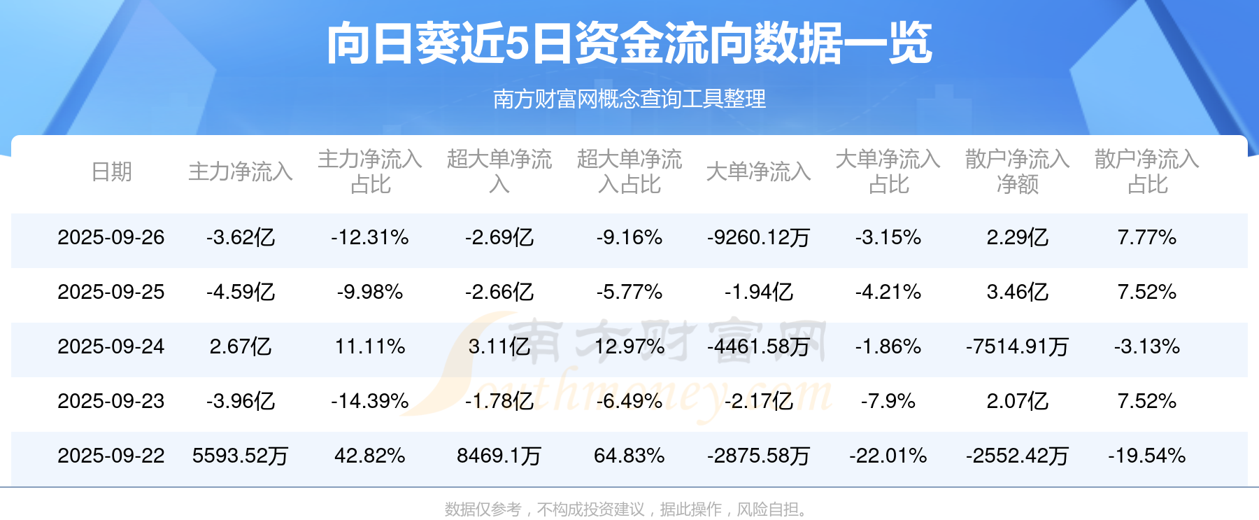 9月26日消息,向日葵資金凈流出3.62億元,超大單資金凈流出2.69億元,換手率29.06%,成交金額29.42億元。
