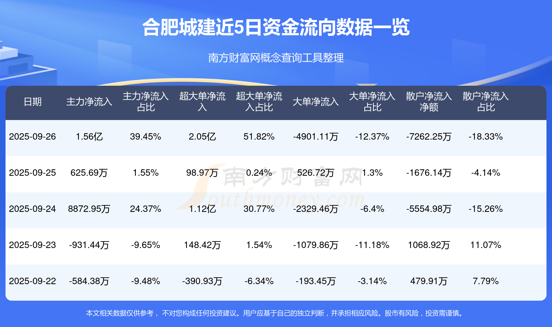 9月26日消息,合肥城建9月26日主力資金凈流入1.56億元,超大單資金凈流入2.05億元,大單資金凈流出4901.11萬元,散戶資金凈流出7262.25萬元。