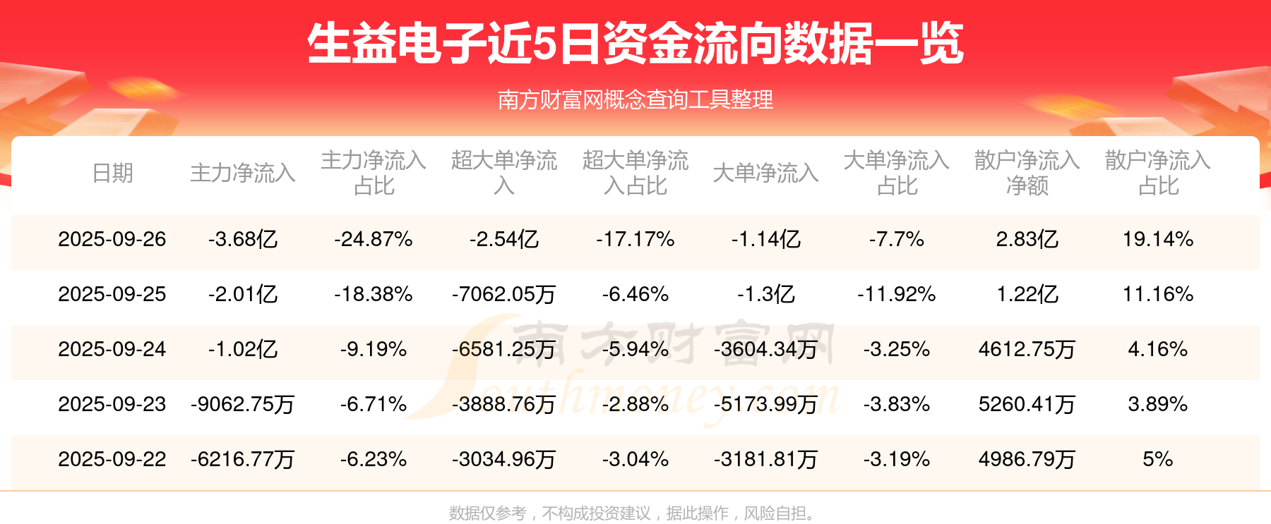 9月26日消息,生益電子9月26日主力資金凈流出3.68億元,超大單資金凈流出2.54億元,大單資金凈流出1.14億元,散戶資金凈流入2.83億元。