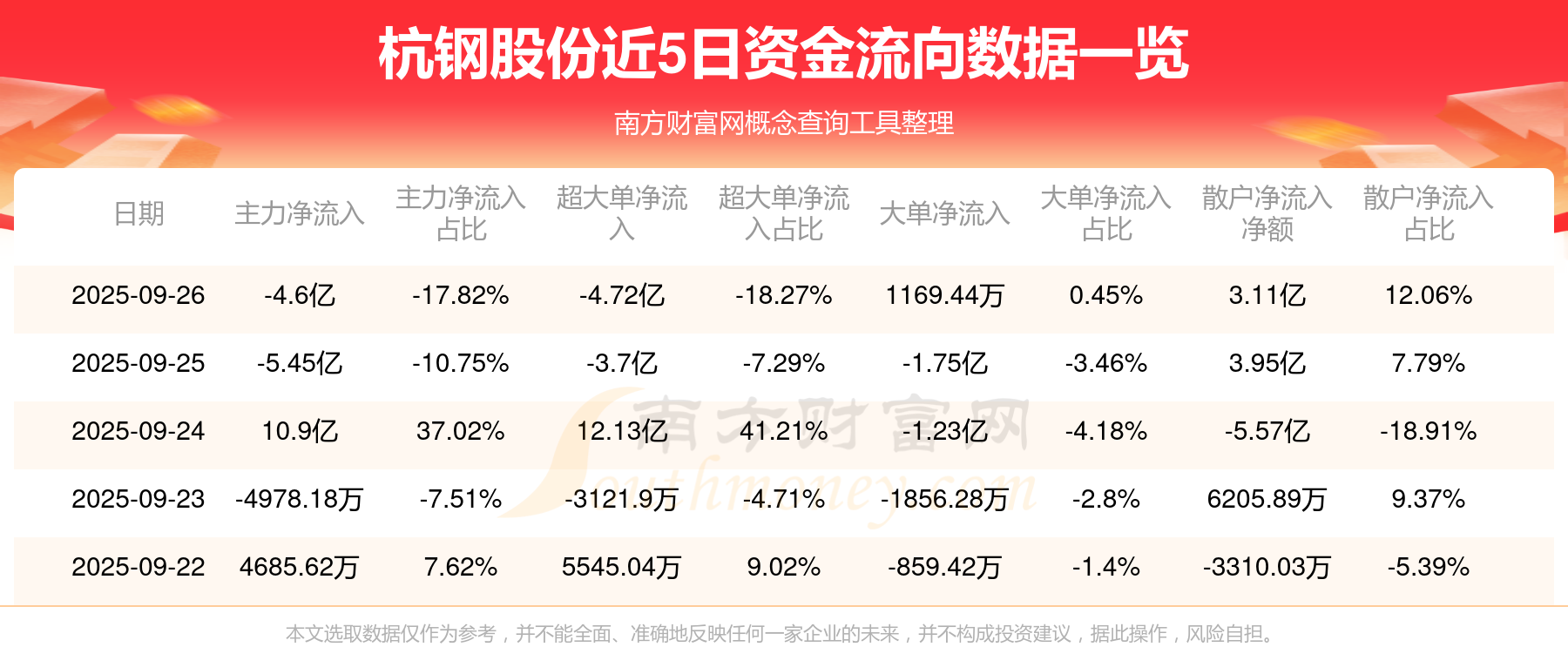 9月26日消息,杭鋼股份9月26日主力凈流出4.6億元,超大單凈流出4.72億元,大單凈流入1169.44萬元,散戶凈流入3.11億元。