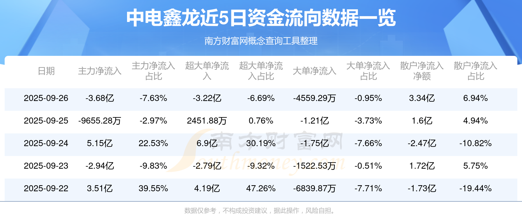 9月26日消息,中電鑫龍9月26日主力資金凈流出3.68億元,超大單資金凈流出3.22億元,大單資金凈流出4559.29萬元,散戶資金凈流入3.34億元。