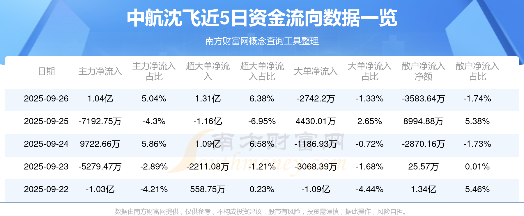 9月26日消息,中航沈飛資金凈流入1.04億元,超大單資金凈流入1.31億元,換手率1.14%,成交金額20.4億元。