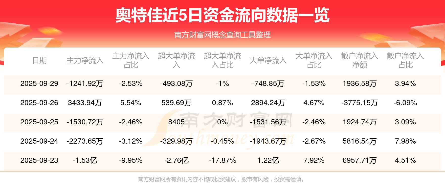 9月29日消息,奧特佳主力資金凈流出1241.92萬元,超大單資金凈流出493.08萬元,散戶資金凈流入1936.58萬元。
