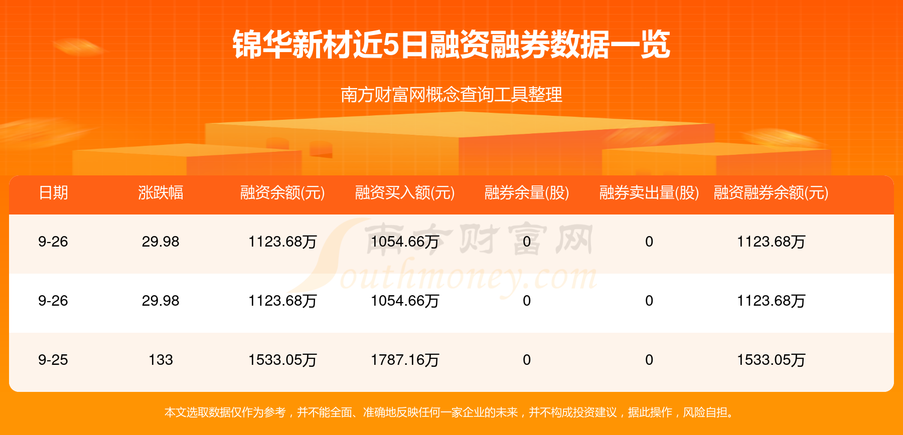 錦華新材9月26日融券信息顯示,融資方面,當日融資買入1054.66萬元,融資償還1464.03萬元,融資凈買額-409.37萬元。近5日融資融券數(shù)據一覽見下表: