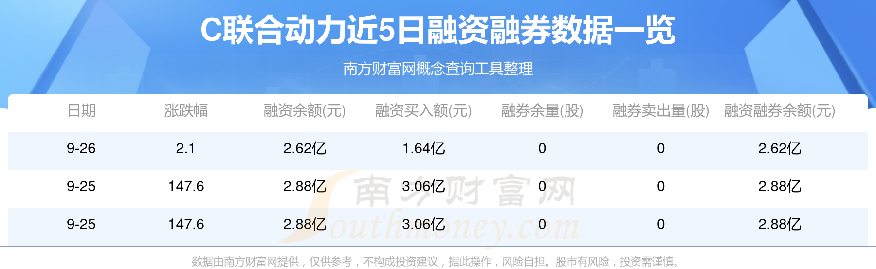9月26日C聯(lián)合動(dòng)力融券信息顯示,融資方面,當(dāng)日融資買(mǎi)入1.64億元,融資償還1.9億元,融資凈買(mǎi)額-2666.55萬(wàn)元。近5日融資融券數(shù)據(jù)一覽見(jiàn)下表: