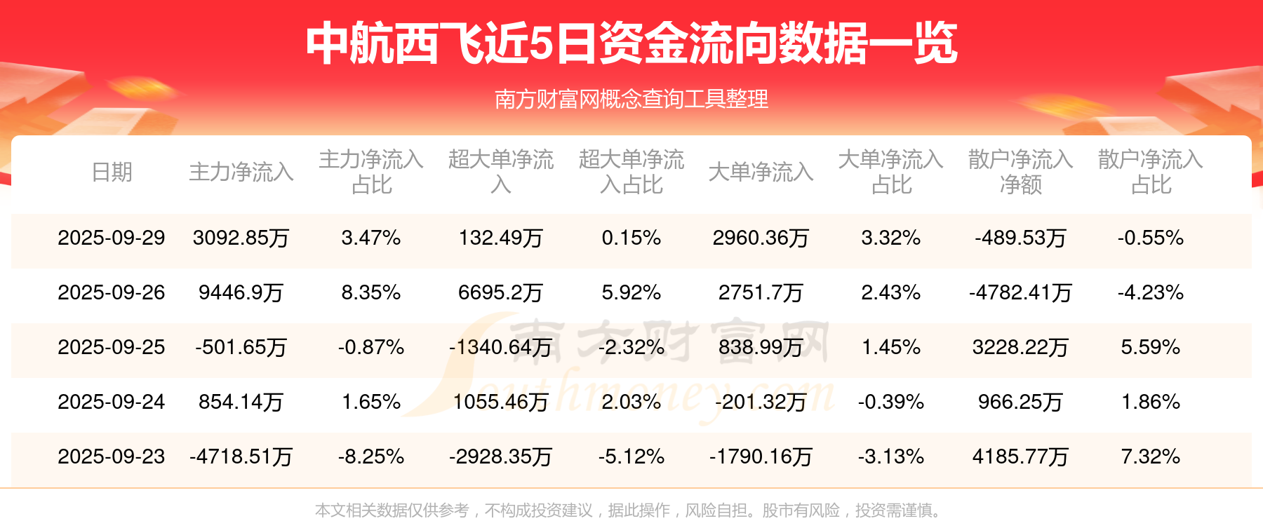 9月29日消息,中航西飛9月29日主力資金凈流入3092.85萬元,超大單資金凈流入132.49萬元,大單資金凈流入2960.36萬元,散戶資金凈流出489.53萬元。
