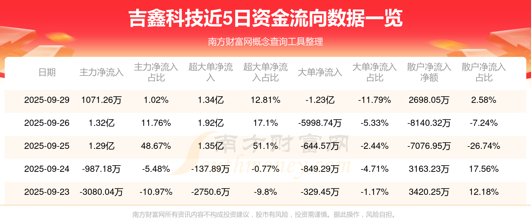 9月29日該股主力資金凈流入1071.26萬(wàn)元,超大單資金凈流入1.34億元,大單資金凈流出1.23億元,中單資金凈流出3769.31萬(wàn)元,散戶資金凈流入2698.05萬(wàn)元。