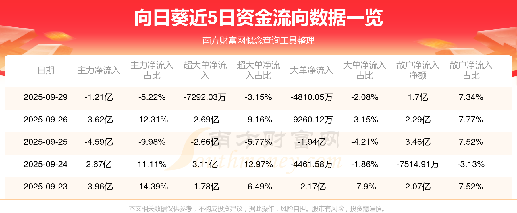 9月26日,向日葵開(kāi)盤(pán)報(bào)8.65元,截至13時(shí)19分,報(bào)7.500元,成交額23.17億元,換手率23.5%,市值為96.54億元。