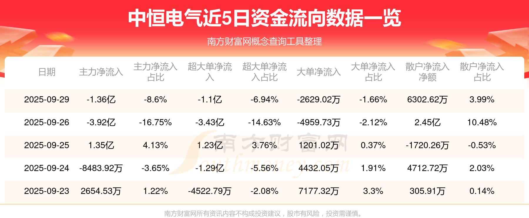 9月29日消息,中恒電氣9月29日主力資金凈流出1.36億元,超大單資金凈流出1.1億元,大單資金凈流出2629.02萬元,散戶資金凈流入6302.62萬元。