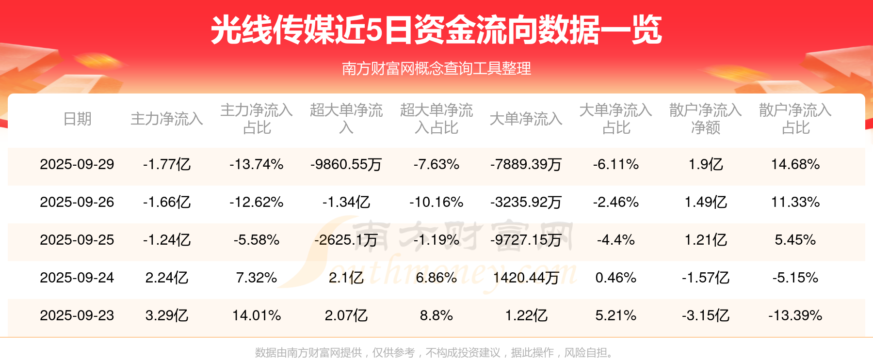9月29日消息,光線傳媒9月29日主力資金凈流出1.77億元,超大單資金凈流出9860.55萬元,大單資金凈流出7889.39萬元,散戶資金凈流入1.9億元。