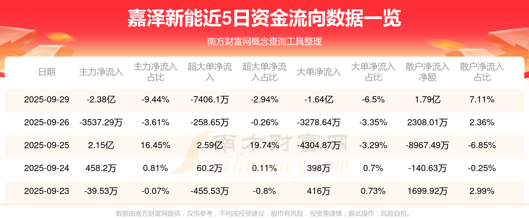9月29日消息,嘉澤新能主力凈流出2.38億元,超大單凈流出7406.1萬元,散戶凈流入1.79億元。