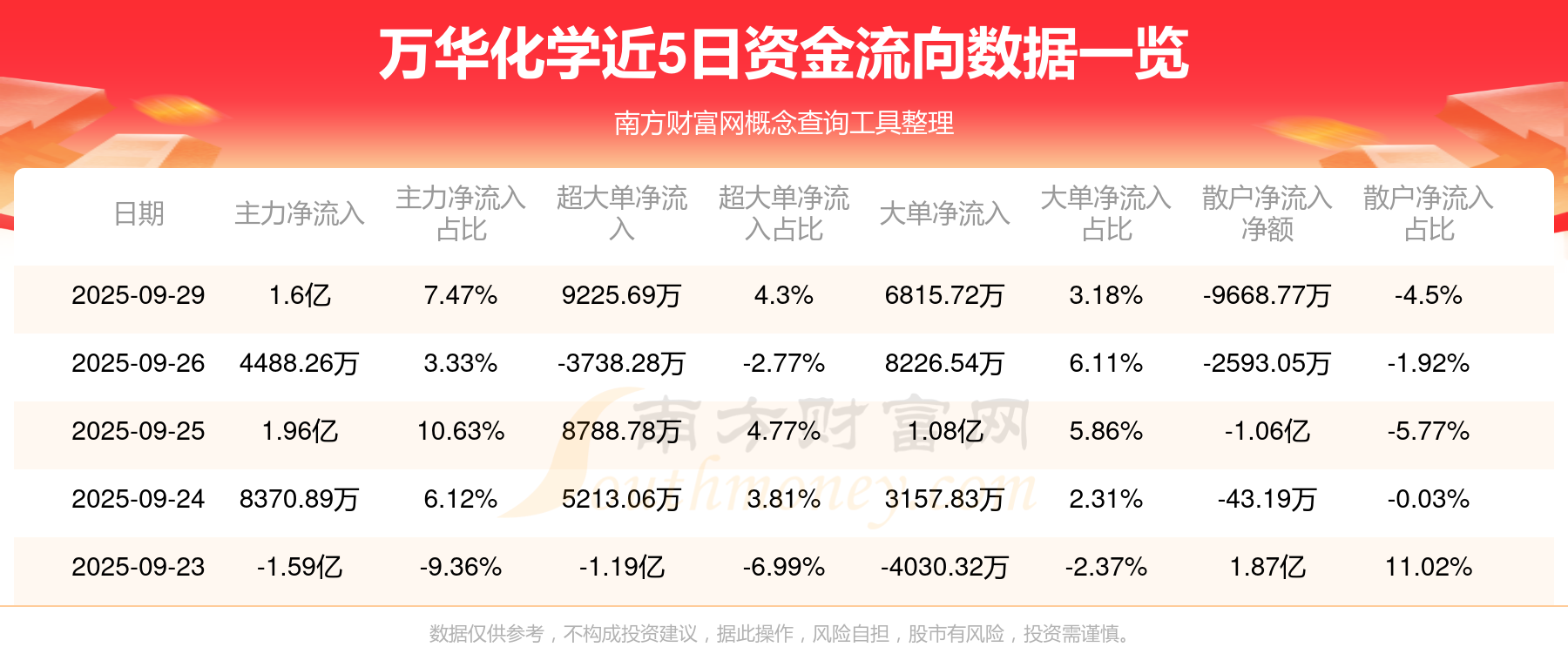 9月29日消息,萬(wàn)華化學(xué)9月29日主力凈流入1.6億元,超大單凈流入9225.69萬(wàn)元,大單凈流入6815.72萬(wàn)元,散戶凈流出9668.77萬(wàn)元。