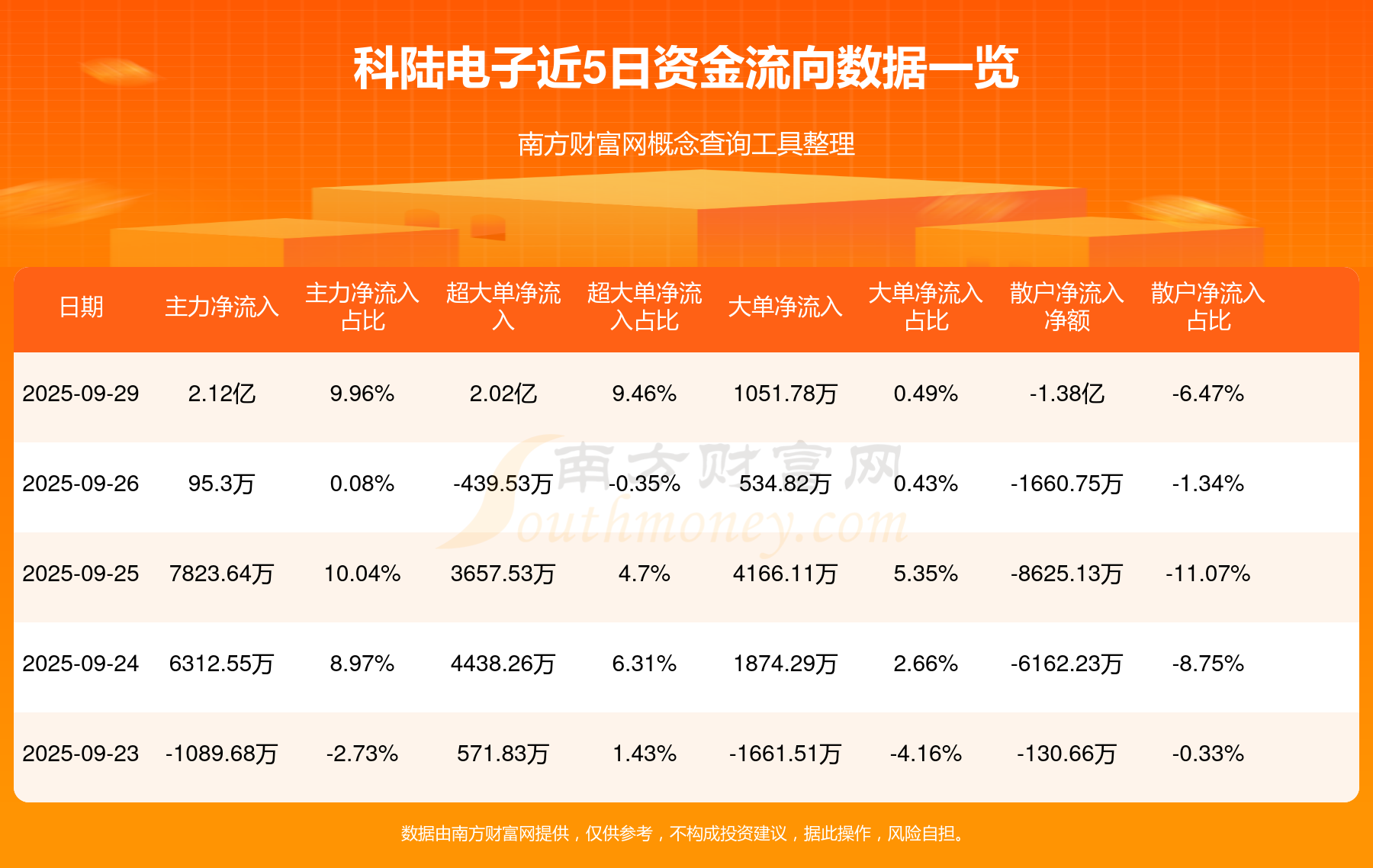 9月29日消息,科陸電子主力資金凈流入2.12億元,超大單資金凈流入2.02億元,散戶(hù)資金凈流出1.38億元。