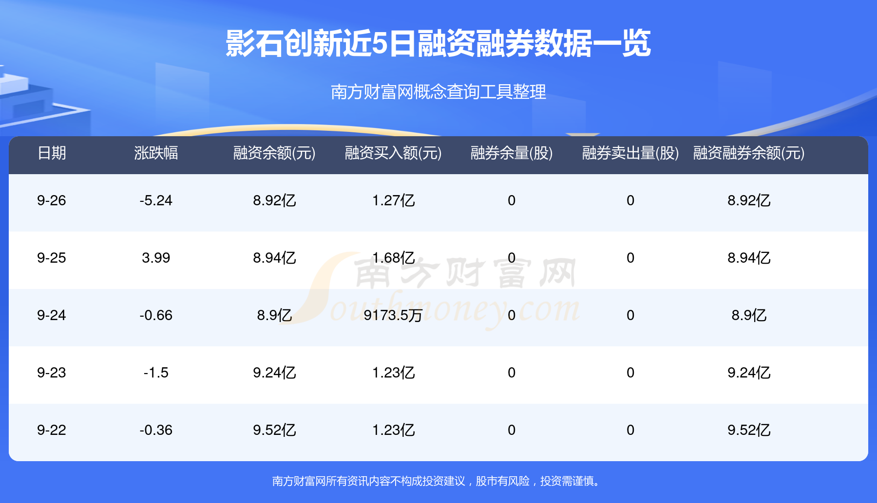 9月26日影石創(chuàng)新融券信息顯示,融資方面,當(dāng)日融資買(mǎi)入1.27億元,融資償還1.28億元,融資凈買(mǎi)額-179.17萬(wàn)元。近5日融資融券數(shù)據(jù)一覽見(jiàn)下表: