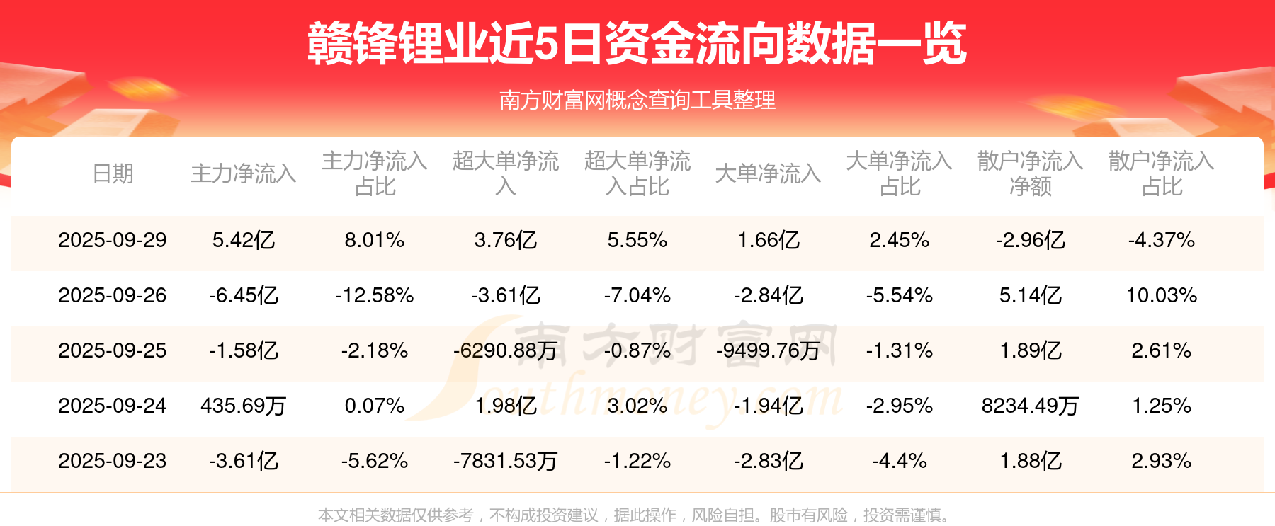 9月29日消息,贛鋒鋰業(yè)9月29日主力凈流入5.42億元,超大單凈流入3.76億元,大單凈流入1.66億元,散戶凈流出2.96億元。
