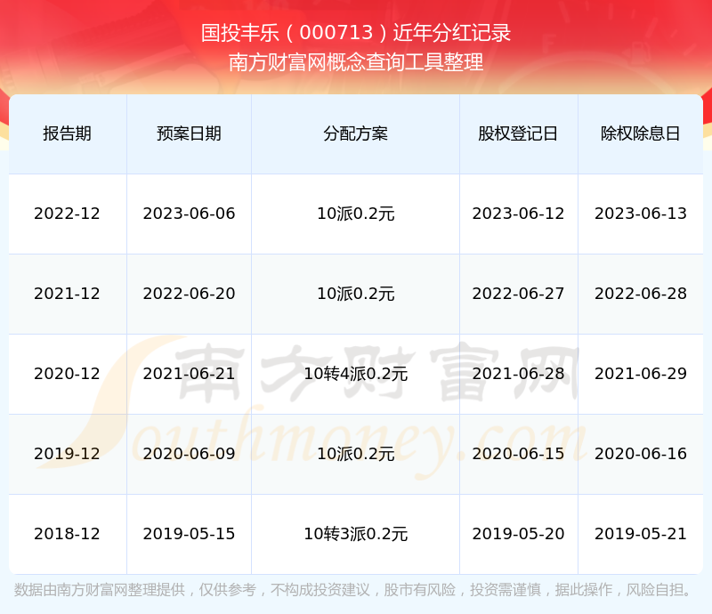 國投豐樂最新一次公布的分紅方案為10派0.2元。本次權(quán)益分派股權(quán)登記日為2023年6月12日,除權(quán)除息日為2023年6月13日,派息日為2023年6月13日。
