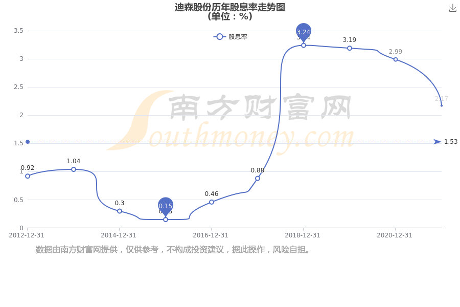 迪森股份最新一次公布的分紅方案:10派1.2元。