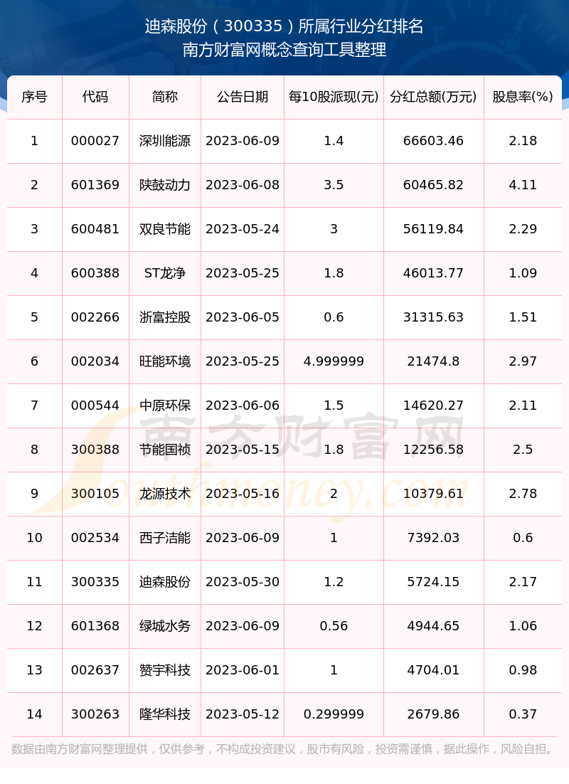 按照南方財(cái)富網(wǎng)趨勢選股系統(tǒng)統(tǒng)計(jì),迪森股份所屬行業(yè)為新能源行業(yè),新能源行業(yè)分紅排名情況如下表: