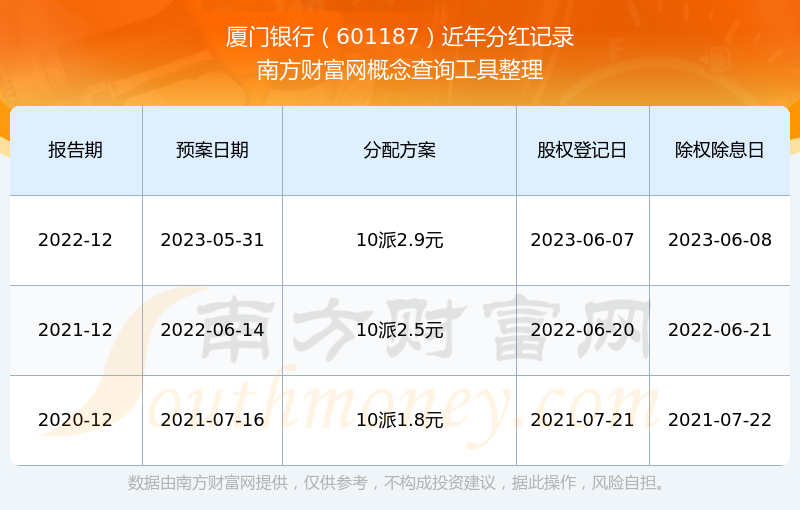廈門銀行最新一次公布的分紅方案為10派2.9元。本次權(quán)益分派股權(quán)登記日為2023年6月7日,除權(quán)除息日為2023年6月8日,派息日為2023年6月8日。