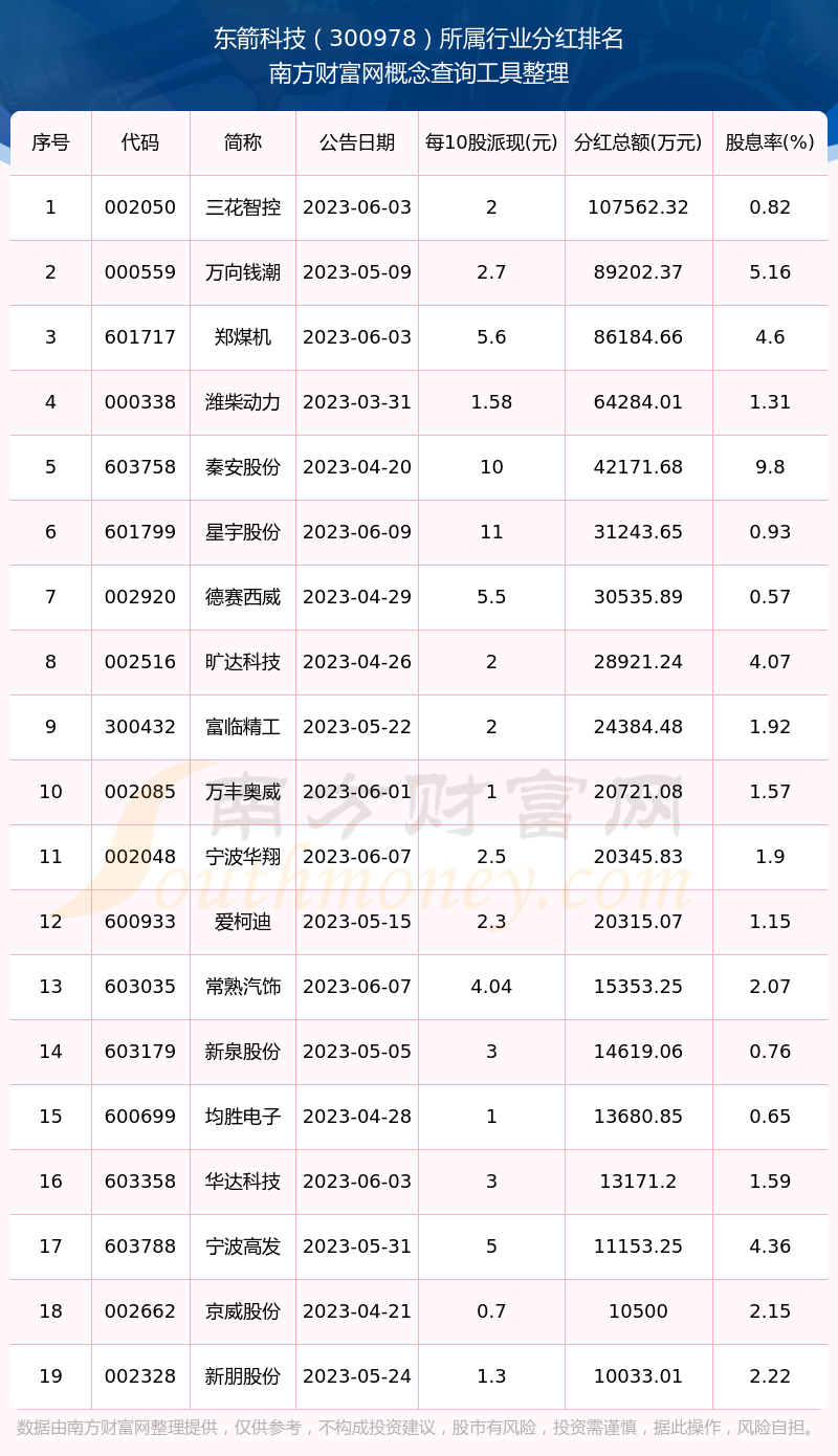 按照南方財富網(wǎng)趨勢選股系統(tǒng)統(tǒng)計,東箭科技所屬行業(yè)為汽車零部件行業(yè),汽車零部件行業(yè)分紅排名情況如下表: