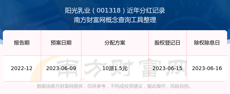 陽(yáng)光乳業(yè)最新一次公布的分紅方案為10派1.5元。本次權(quán)益分派股權(quán)登記日為2023年6月15日,除權(quán)除息日為2023年6月16日,派息日為2023年6月16日。