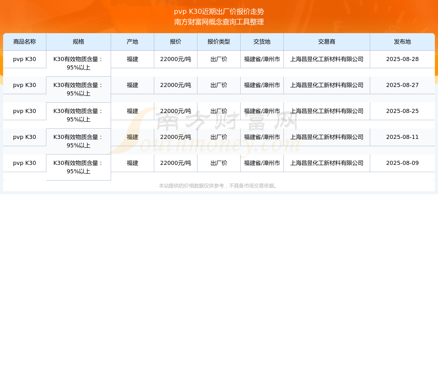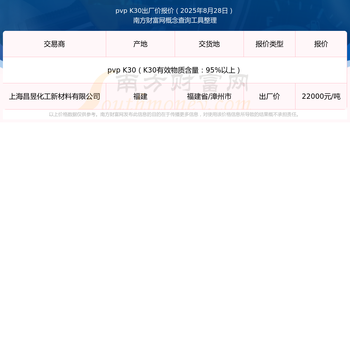 2025年8月28日,pvp K30(K30有效物質(zhì)含量:95%以上)出廠價(jià)價(jià)格為22000.00元/噸,報(bào)價(jià)人:上海昌昱化工新材料有限公司,交易地點(diǎn)為福建省/漳州市。